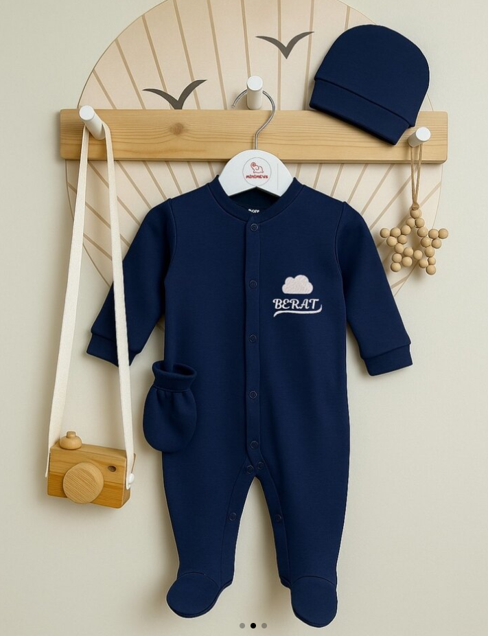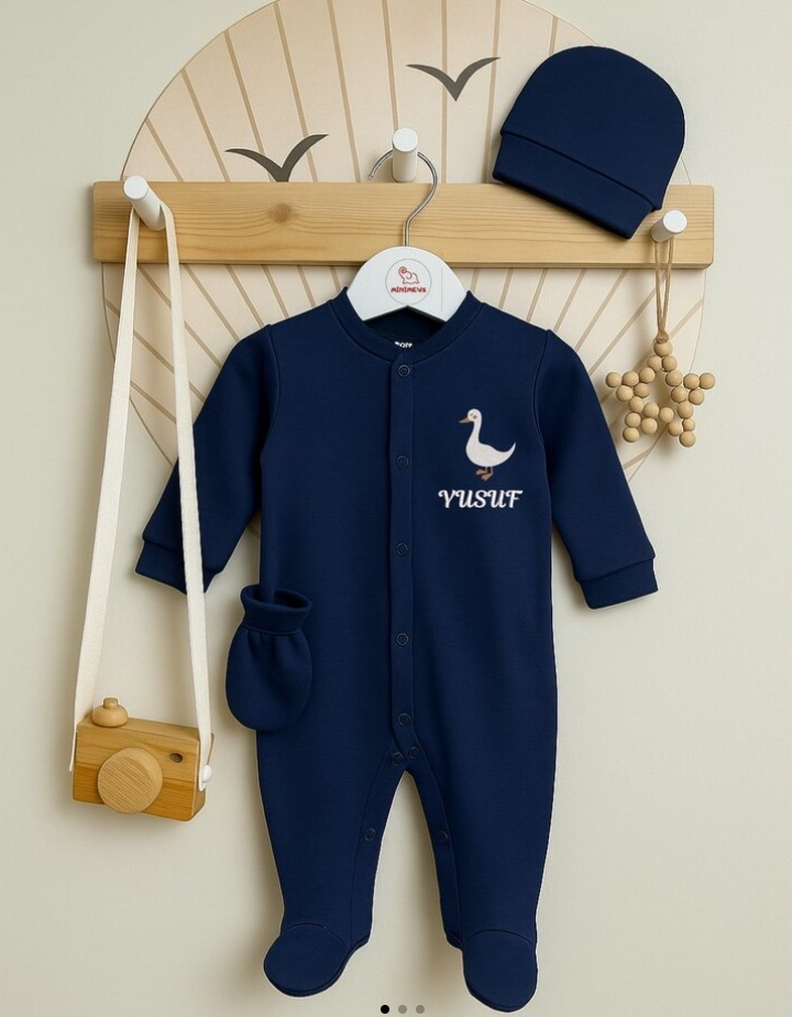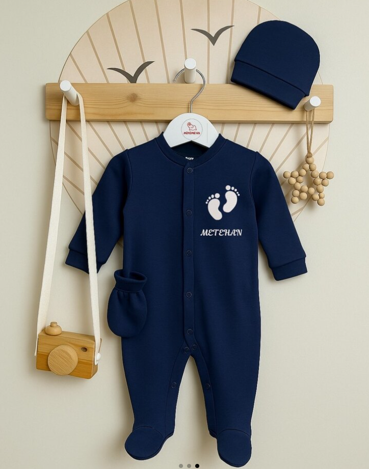 Yumuşacık kumaştan üretilen bu lacivert tulum seti, kişiye özel isim nakışı ve sevimli minimal figürüyle hem şık hem de anlamlı bir hediye alternatifi sunuyor. Eldiveni ve şapkasıyla tam takım olan bu set, yenidoğan bebekler için ideal.